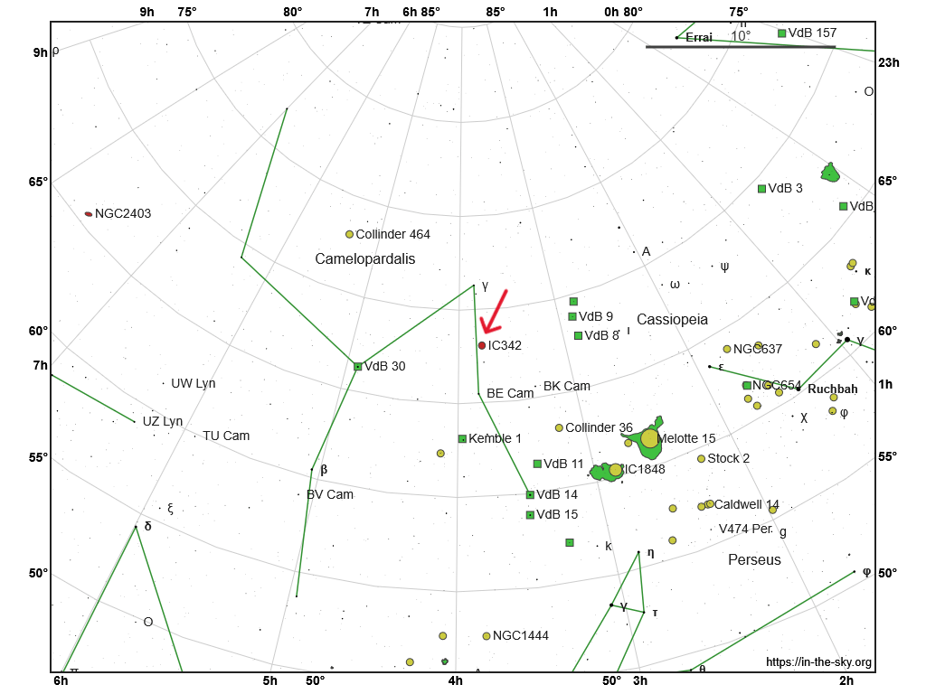 IC342 is a intermediate galaxy in the constellation Camelopardalis,is a Type SAB(rs)cd faced-on spiral 10 million light-years from Earth. This galaxy is also known as the Hidden Galaxy because its location behind dusty areas near our galactic equator makes it difficult to observe. The dust makes it difficult to determine its precise distance; modern estimates range from about 7 to 11 million light-years. IC342’s apparent magnitude is 9.1 and was discovered by William Frederick Denning in 1892.