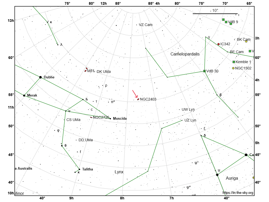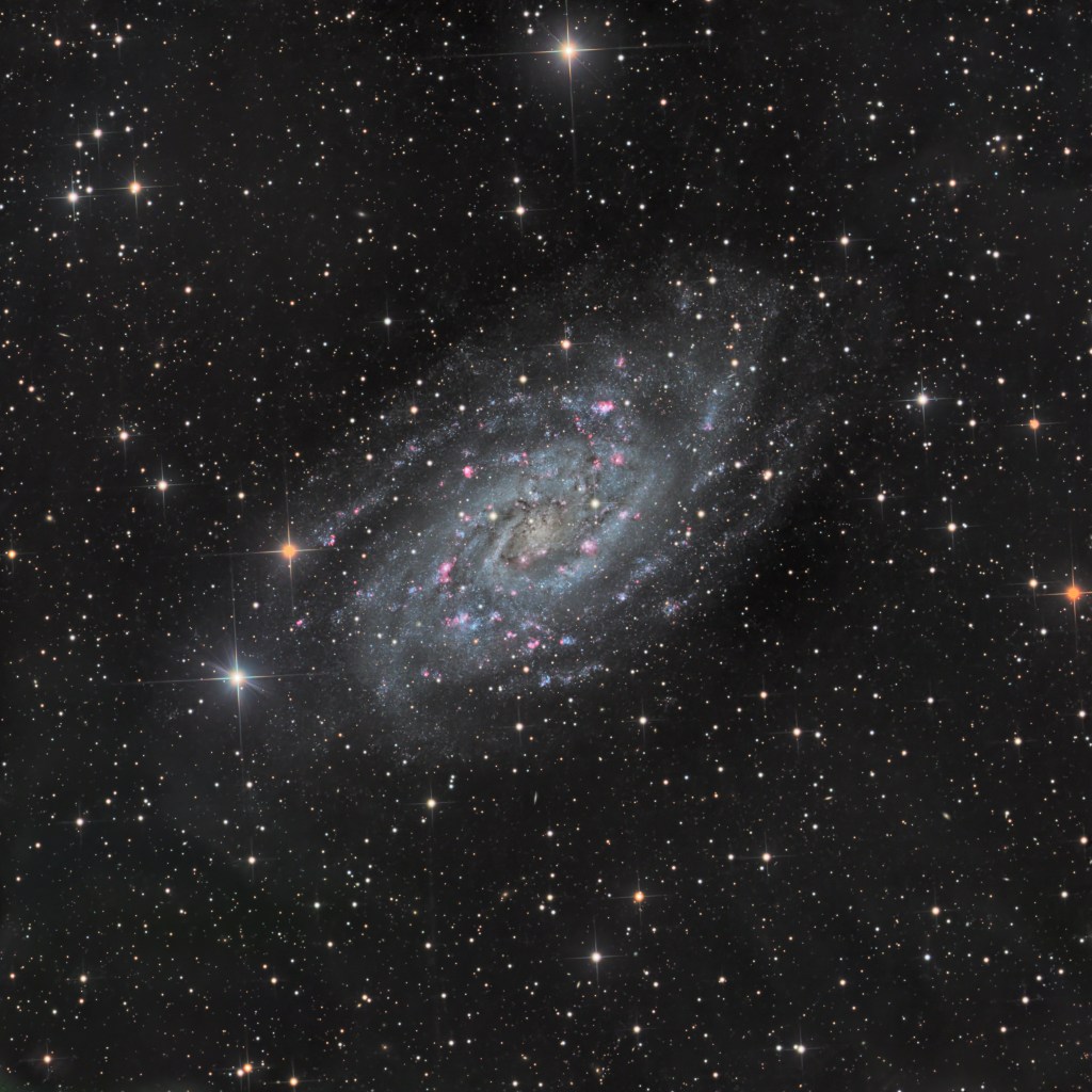 NGC2403 is an intermediate SAB(s)cd spiral 9.65 million light-years from Earth in constellation Camelopardalis and its is an outlying member of the M61 Group. NGC2403’s apparent magnitude is 8.9 and was discovered by William Hershel in November 1788. Edwin Hubble detected Cepheid variables in NGC2403 using the Hale Telescope, making it the first galaxy beyond the Local Group within which a Cepheid was discovered