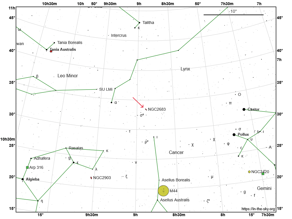 NGC2683 is a field galaxy spiral, type SA(rs)b that is 30.5 million light-years from Earth in constellation Lynx. NGC2683’s apparent magnitude is 10.9 and was discovered by William Hershel in February 1788.