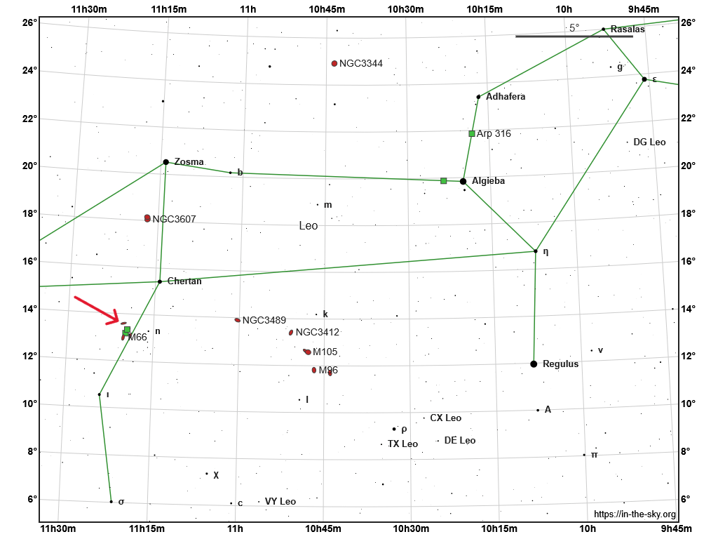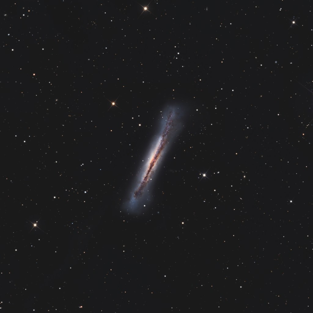 NGC3628, also known as the Hamburger Galaxy, is a unbarred galaxy Type SAb pec edge-on spiral 35 million light-years from Earth in constellation Leo. NGC3628’s apparent magnitude is 9.5 and was discovered by William Hershel in 1784. It has an approximately 300,000 light-years long tidal tail, not shown because of processing out stray light artifacts. Along with M65 and M66, these three galaxies forms the Leo Triplet.