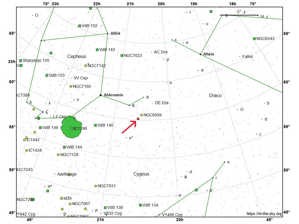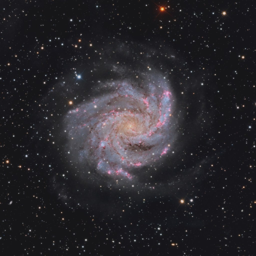 NGC6946, also known as the Fireworks Galaxy, is a Type SAB(rs)cb intermediate spiral galaxy 25.2 million light-years from Earth in constellation Cepheus and Cygnus. NGC6946 has also been classified as a double-barred spiral galaxy, with the inner, smaller bar presumably responsible for funneling gas into its center. This galaxy is similar to the distance of M101 in the constellation URSA Major. Both were once considered to be part of the Local Group, but are now known to be among the dozen bright spiral galaxies near the Milky Way but beyond the confines of the Local Group. NGC6946 lies within the Virgo Super-cluster. NGC6946 apparent magnitude is 9.6 and was discovered by William Herschel in 1798.