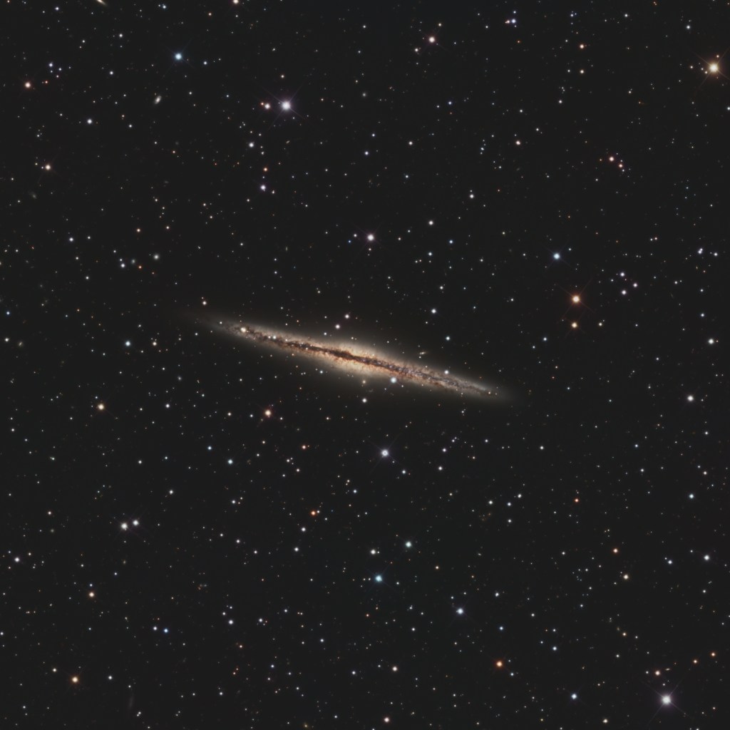 NGC891 reveals its thick plane of dust and interstellar gas. While initially thought to look like our own Milky Way if seen from the side, more detailed surveys revealed the existence of filaments of dust and gas escaping the plane of the galaxy into the halo over hundreds of light-years. They can be clearly seen here against the bright background of the galaxy halo, expanding into space from the disk of the galaxy. Astronomers believe these filaments to be the result of the ejection of material due to supernovae or intense stellar formation activity.